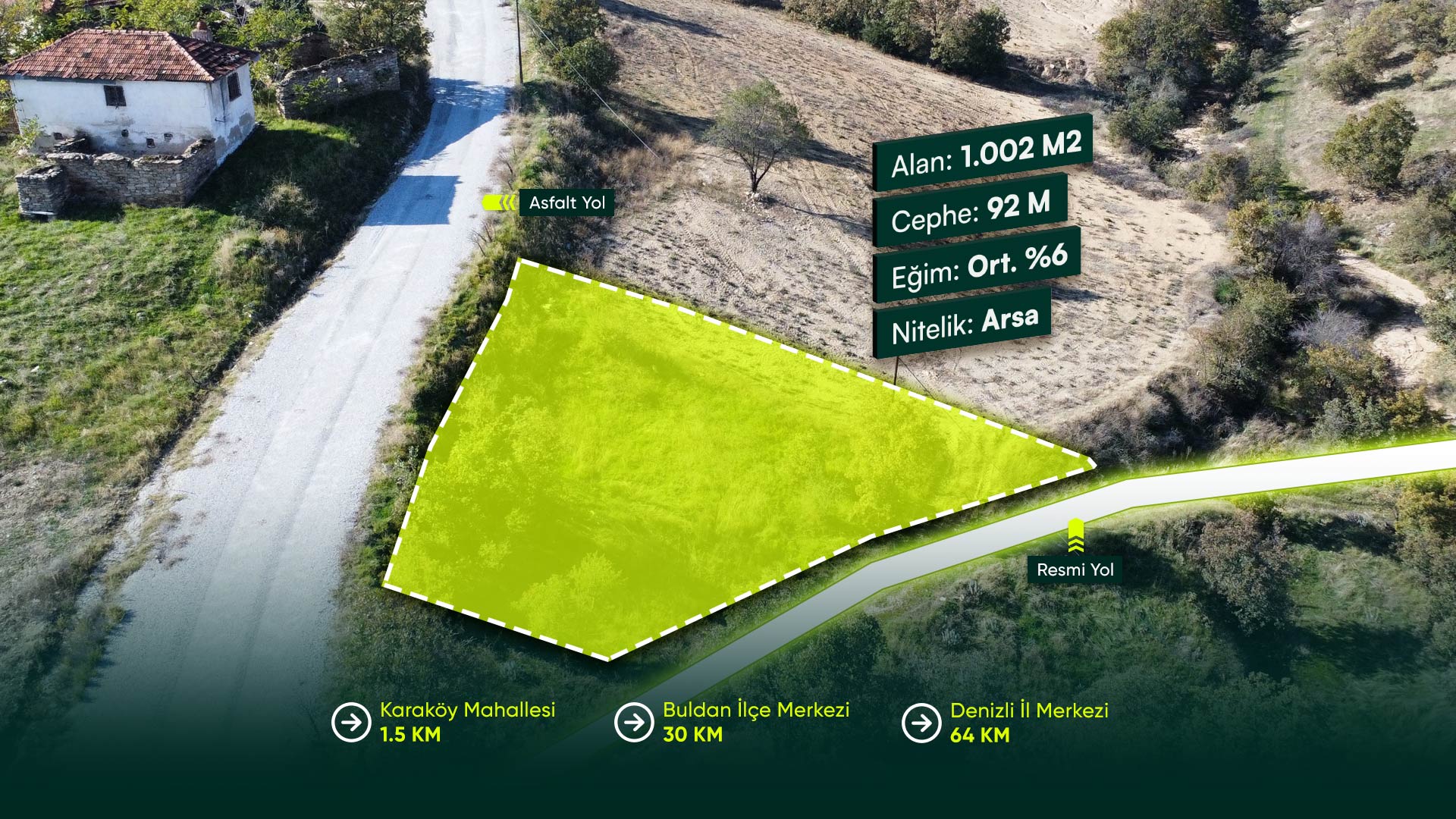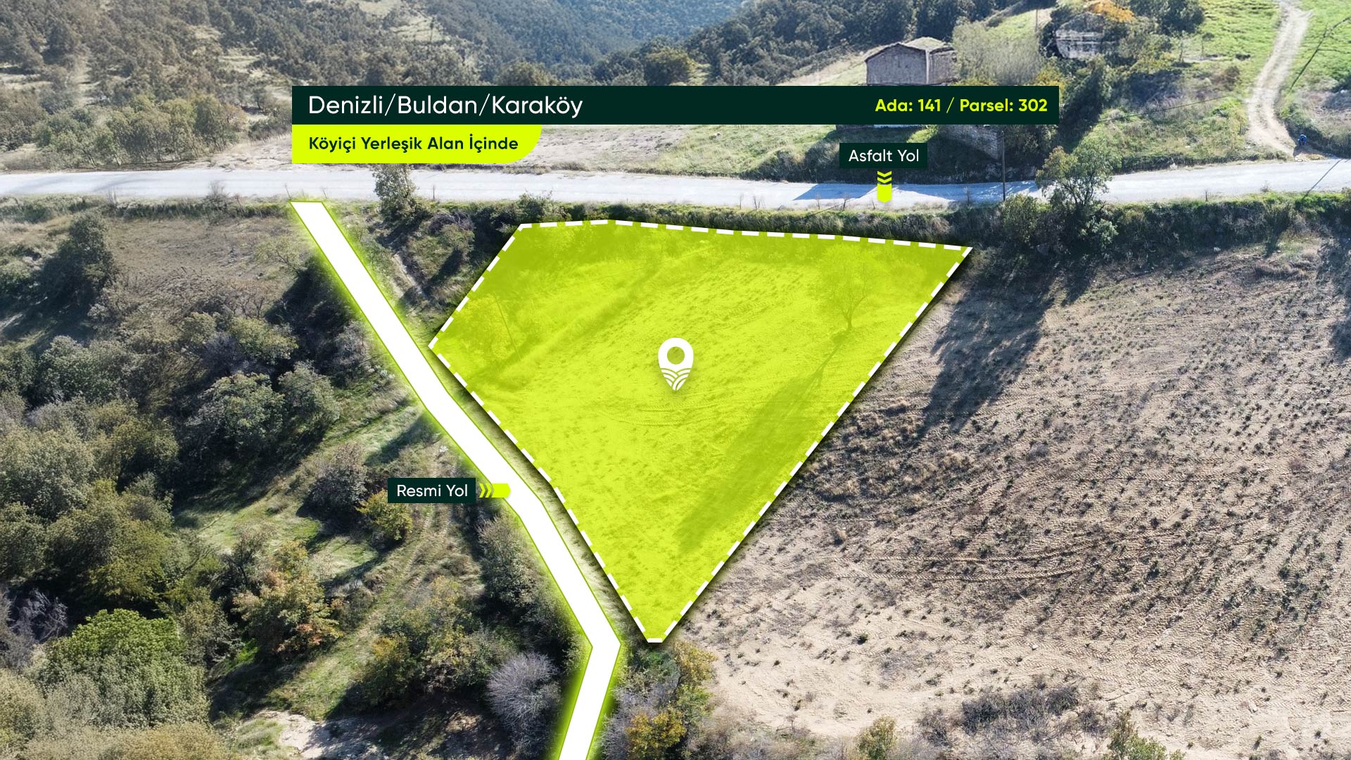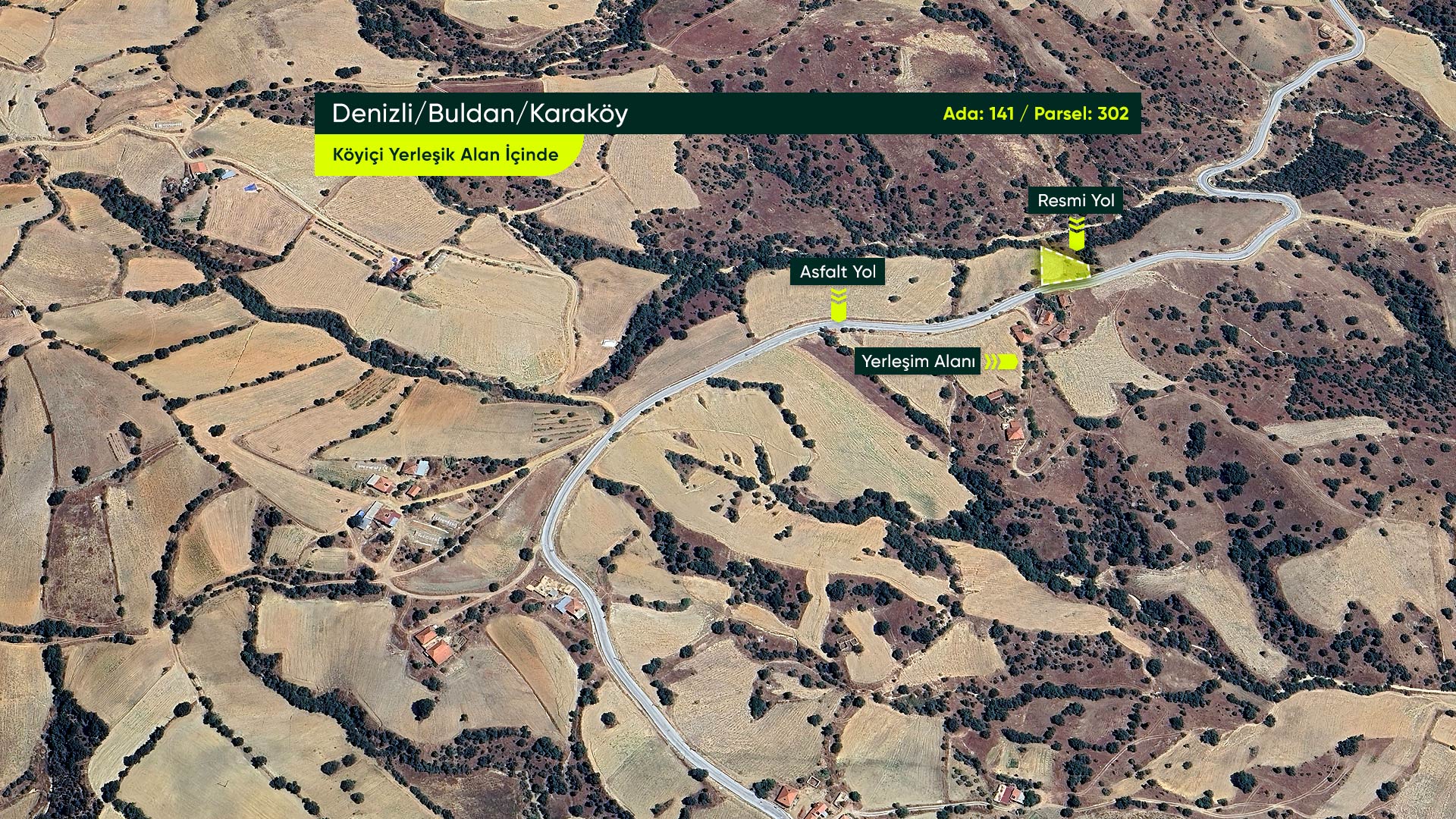 Denizli Buldan Karaköy Mahallesi’nde, Asfalt Yola Cephe, Köşe Parsel, Yerleşime Yakın 1.002 m² Konut İmarlı Arsa