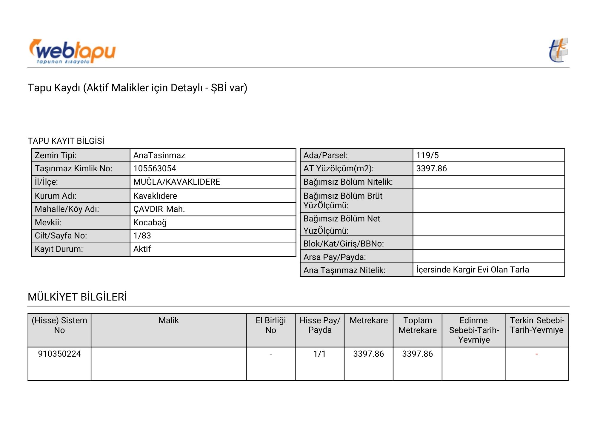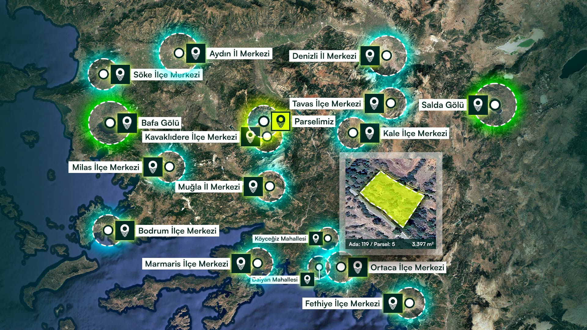 Muğla Kavaklıdere Çavdır Mahallesi’nde İlçe Merkezine Yakın, İfrazlık, Konut İmarlı 3.397 m² Arsa