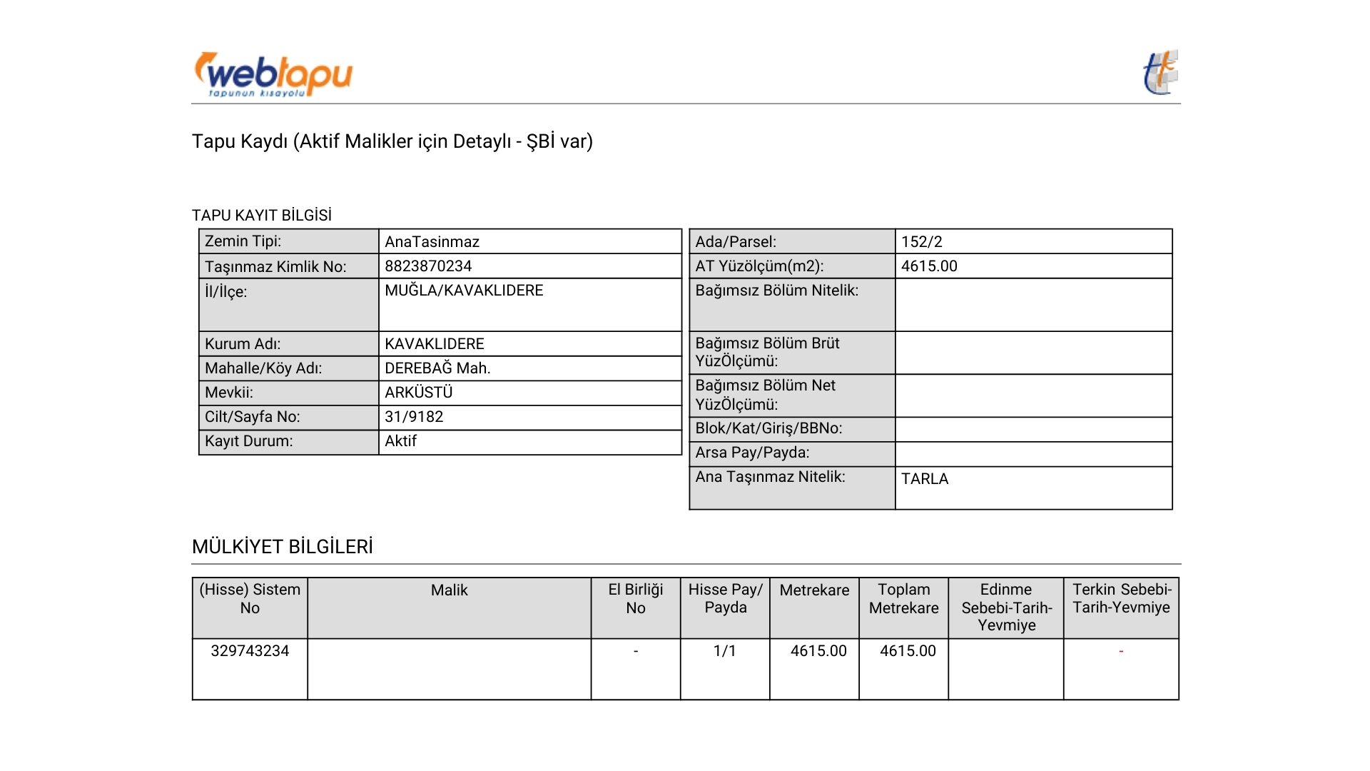 Muğla Kavaklıdere Derebağ’da 4.615 m² Tarla – Yerleşik Alan İçinde, İmara Dönüşüm Potansiyelli