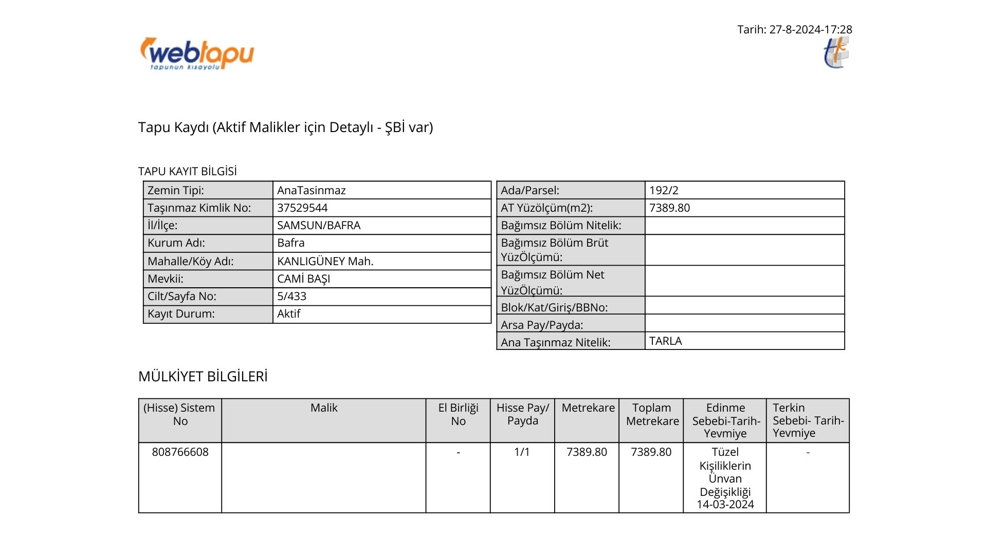 Samsun Bafra Kanlıgüney'de İçerisinde Kaynak Suyu Bulunan 7.389 m2 Tarla Fırsatı